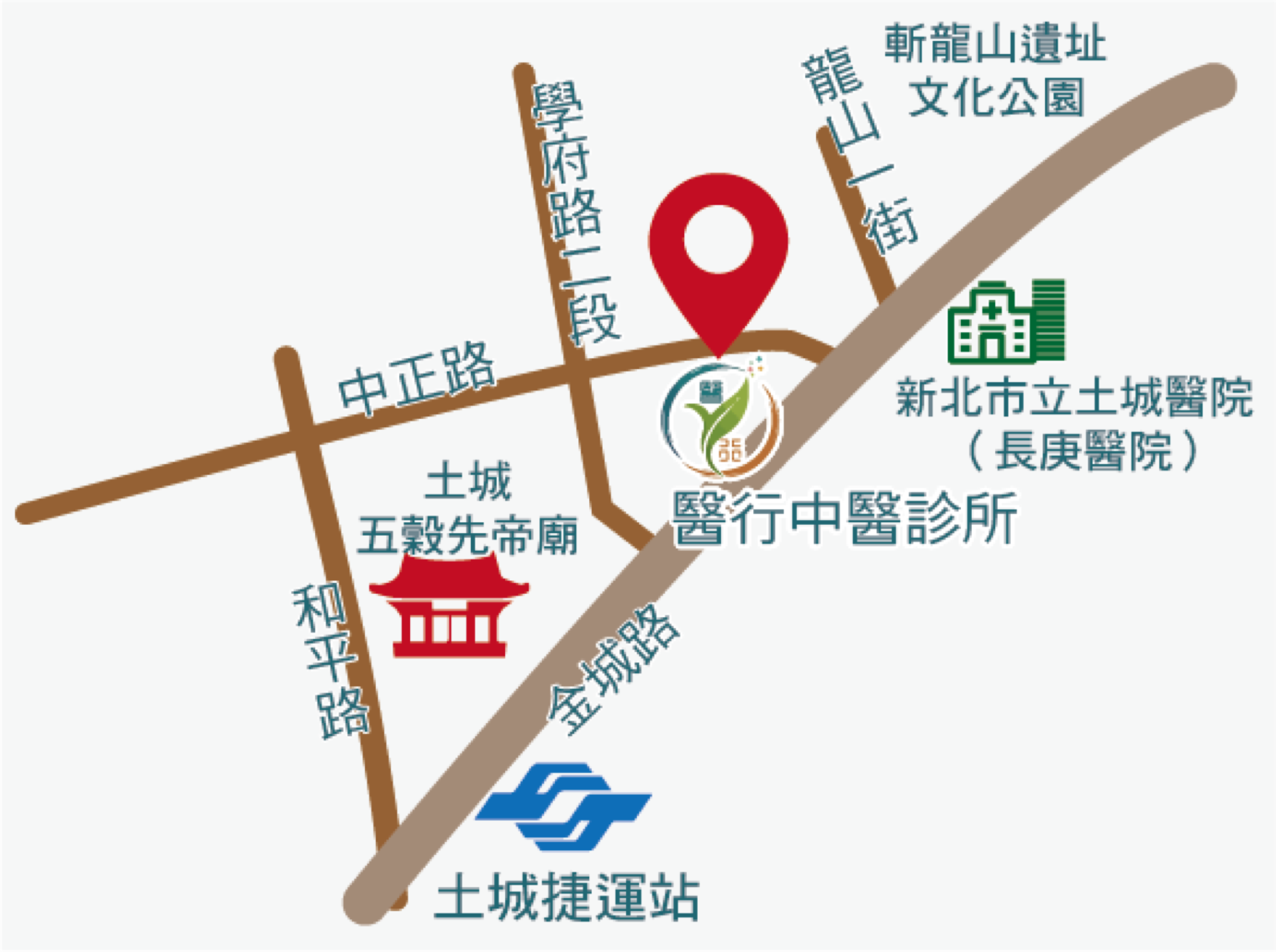 捷運土城站:一號出口,步行時間約5-8分鐘